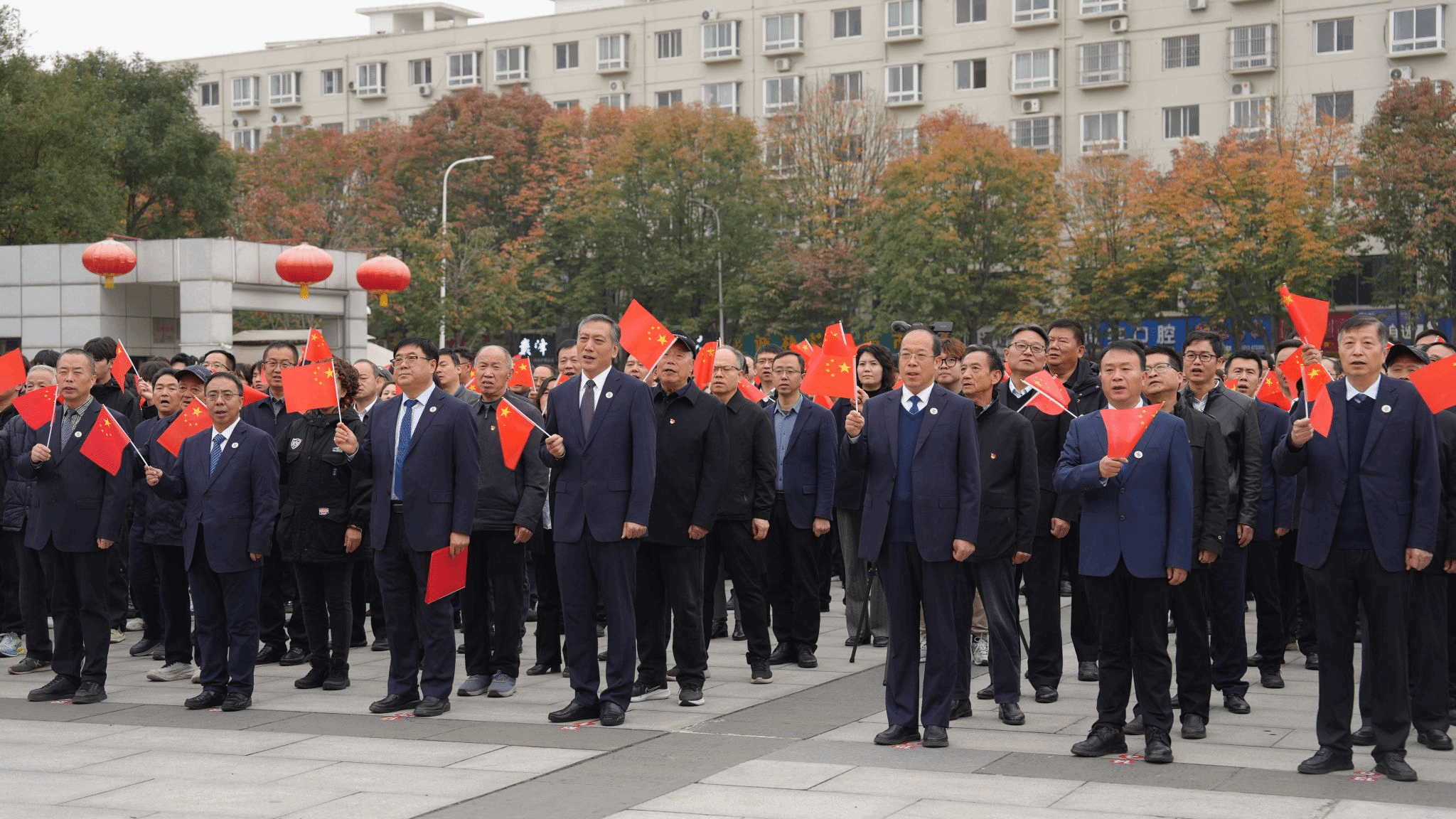 全体人员在领唱的带领下挥舞国旗、齐声高唱《歌唱祖国》