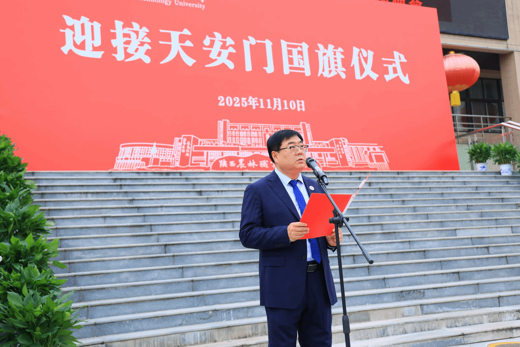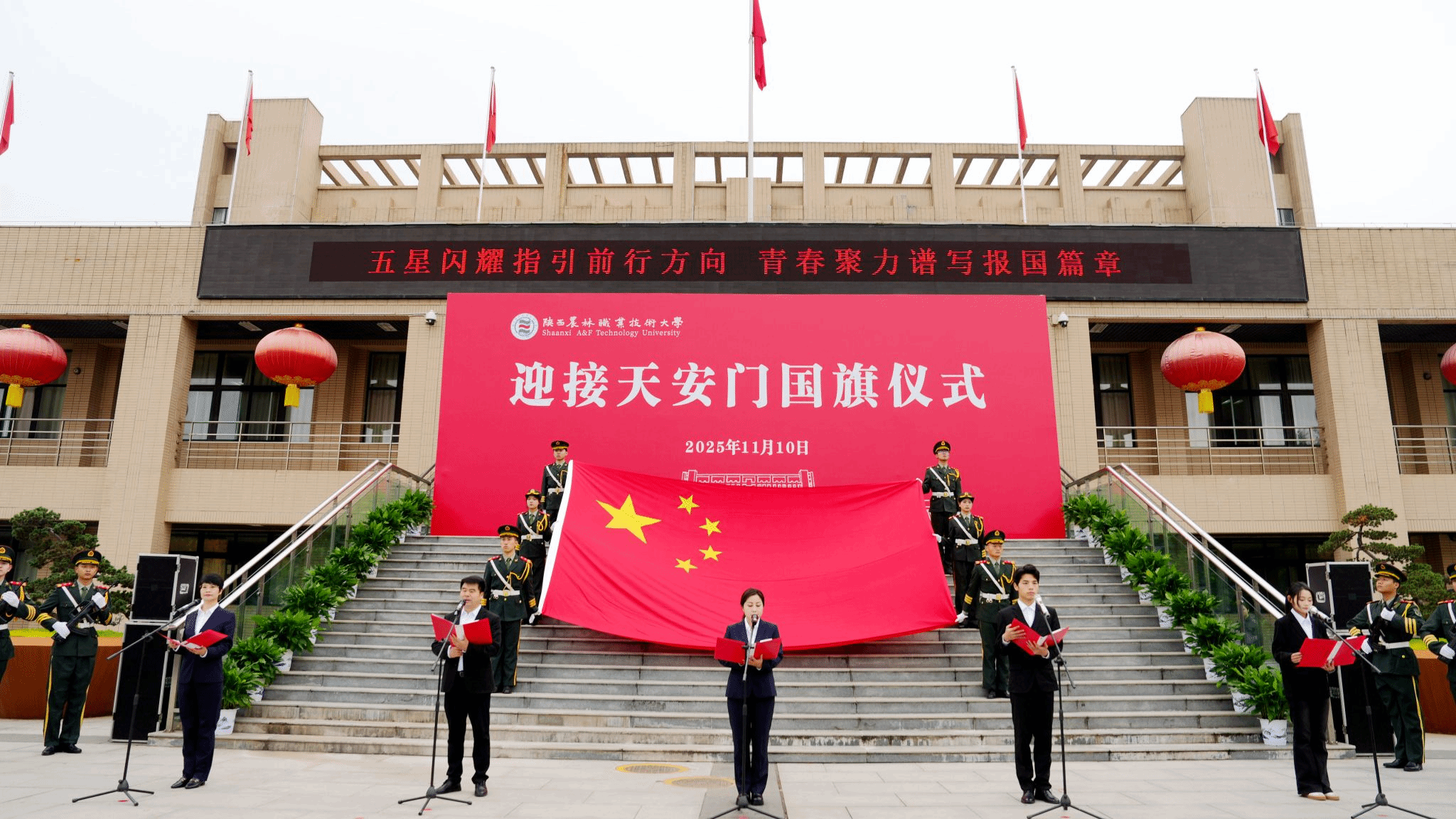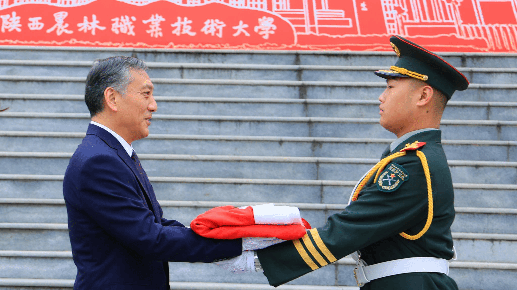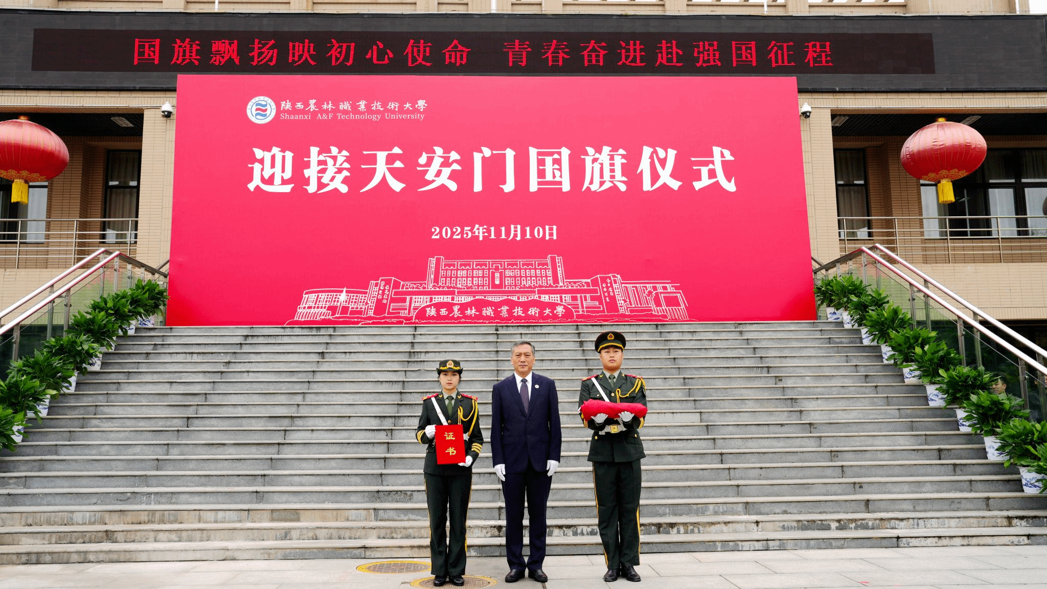 上午10时,仪式在雄壮的国歌声中正式开始。党委书记韩明军郑重宣读了由北京市天安门管理委员会颁发的获赠证书。他介绍,10月31日,北京市天安门管理委员会向学校赠送了2025年6月9日在天安门广场升挂的国旗。6月9日当天,天安门广场天气晴朗,风和日丽,该面编号为2025-0160的国旗,长5米,高3.3米,重1800克,整幅旗面无拼接,五颗五角星采用人工丝网印染工艺,于当天上午4时46分在天安门广场冉冉升起、迎风飘扬。国旗是国家的象征和标志,天安门广场升挂的国旗具有唯一性和特殊的历史价值,是蕴含特殊意义的爱国主义教育载体,承载着亿万中华儿女深厚爱国情怀。值得特别铭记的是,2025年6月9日也是教育部发文批准设立陕西农林职业技术大学之日,获赠2025年6月9日在天安门广场升挂的国旗,是对学校办学91年最好的总结,也承载着国家对陕西农林职业技术大学的殷殷期望,我们一定按照习近平总书记的嘱托,矢志强农报国,努力培养更多知农爱农的专业人才,为建设农业强国、推进中国式现代化作出新的贡献。