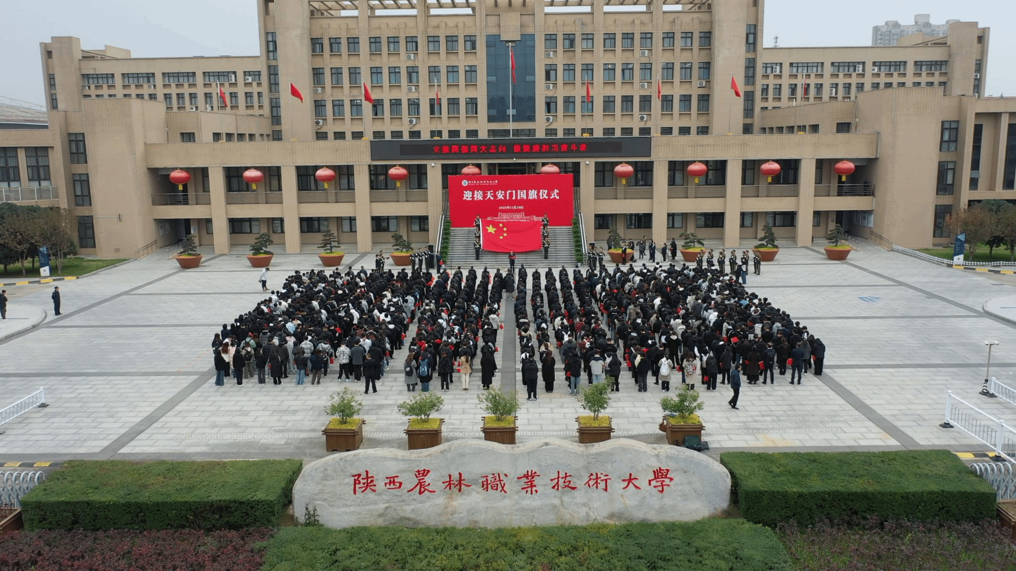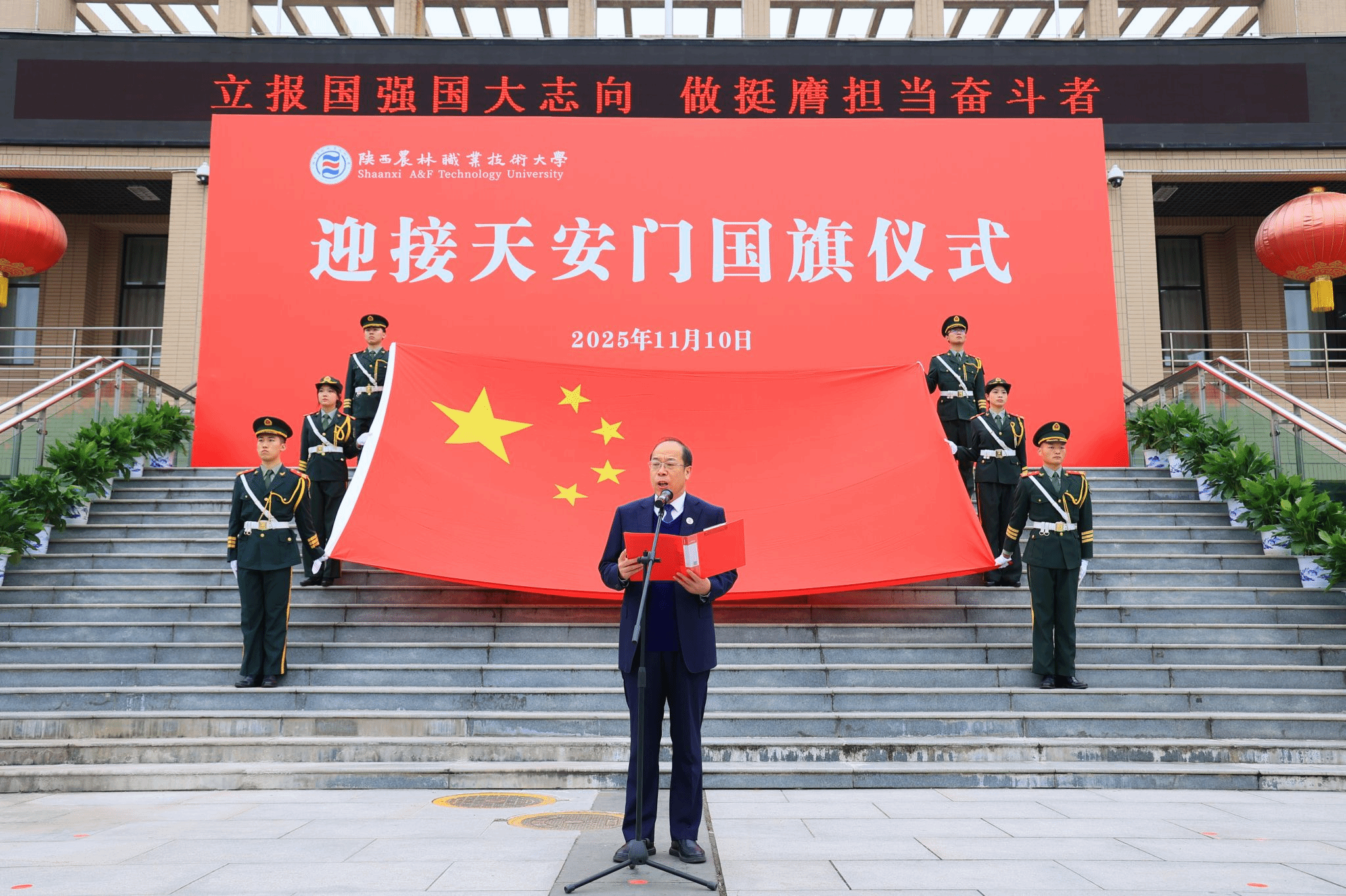 校长仲伟周在讲话中指出,学校自诞生之日起,就植入了红色基因、流淌着红色血液、饱含着爱国深情。建校91年来,始终秉承“经国本、解民生、尚科学”办学理念和“造就西北有志农林者”办学初衷,走出了一条“坚守职教定位、扎根三秦大地、服务国家战略”的特色办学之路,为推动我国农业现代化建设和农业职教事业发展作出了重要贡献。他强调,学校将充分发挥天安门国旗的爱国主义教育特殊载体功能,激发全校师生的爱国情怀、强国使命、兴农担当。他希望,全体师生要赓续红色基因,大力弘扬爱国主义精神;矢志强农报国,奋力书写服务祖国新篇;挺膺实干奋进,努力担当技能强国重任。要以更高的历史站位、更远大的办学理想、更昂扬的斗志作风,在奋力建设中国特色世界一流职业大学,奔赴充满光荣和梦想的新征程上,续写学校事业高质量发展的恢弘新篇章。