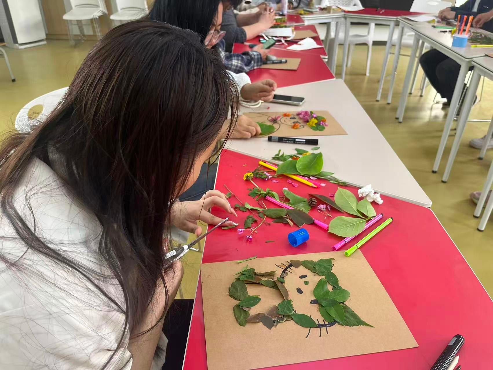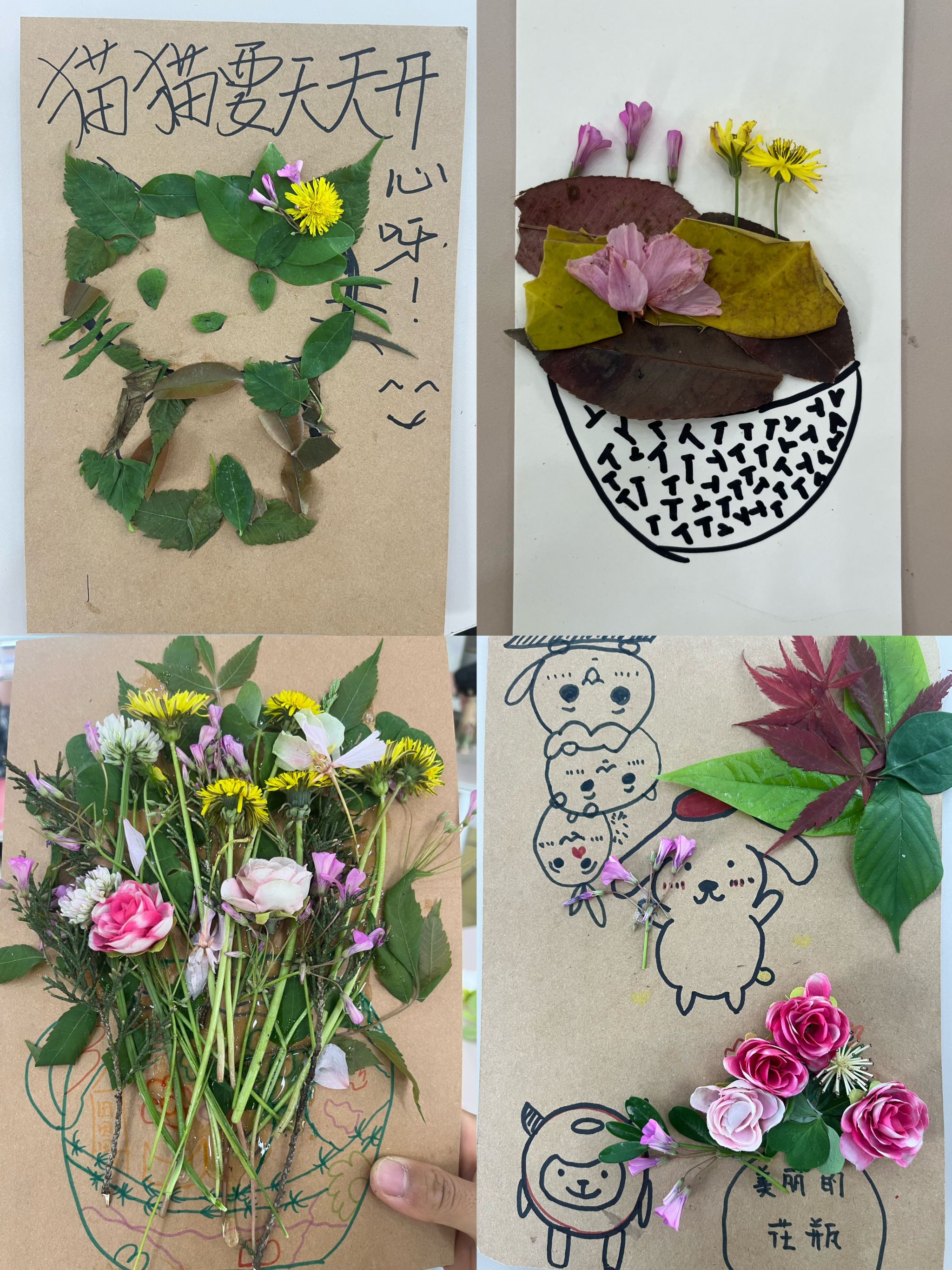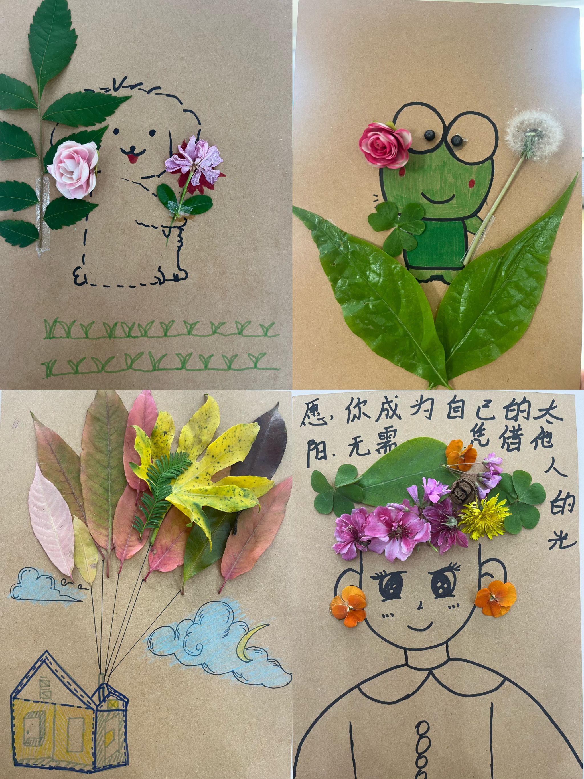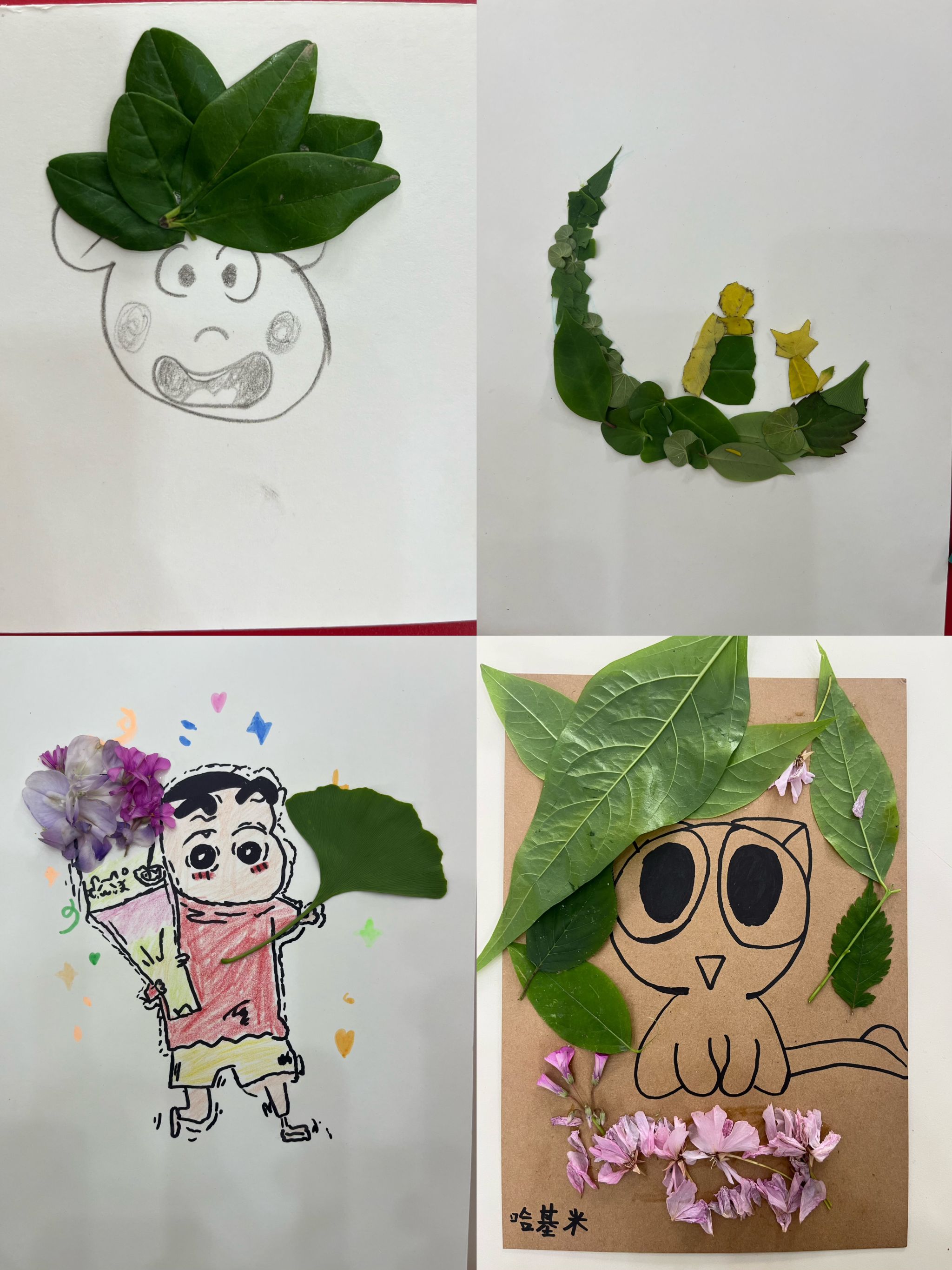 创意拼贴环节中,同学们以收集到的草木、花瓣等自然元素为创作材料,将个人情绪感受、成长感悟融入作品创作,无需遵循标准模板,不追求形式上的完美,让每一片叶、每一根枝、每一朵花都成为个人内心状态的具象表达,最终形成各具特色、独属于参与者个人的自然拼贴作品。
