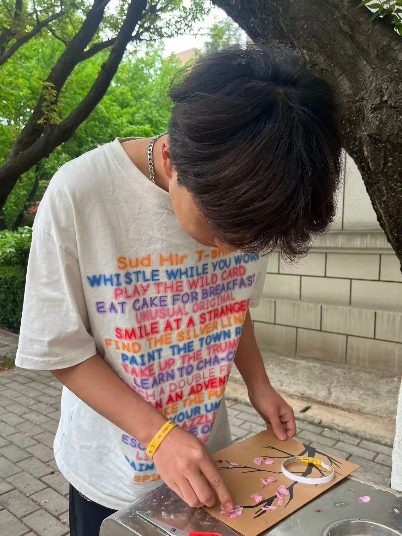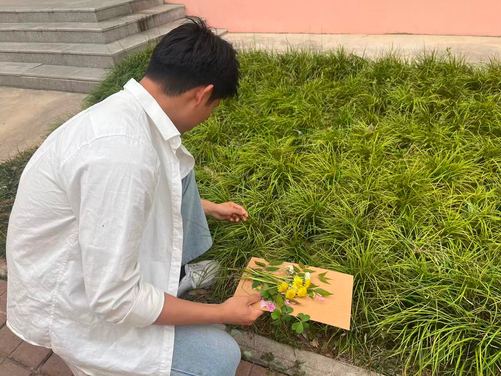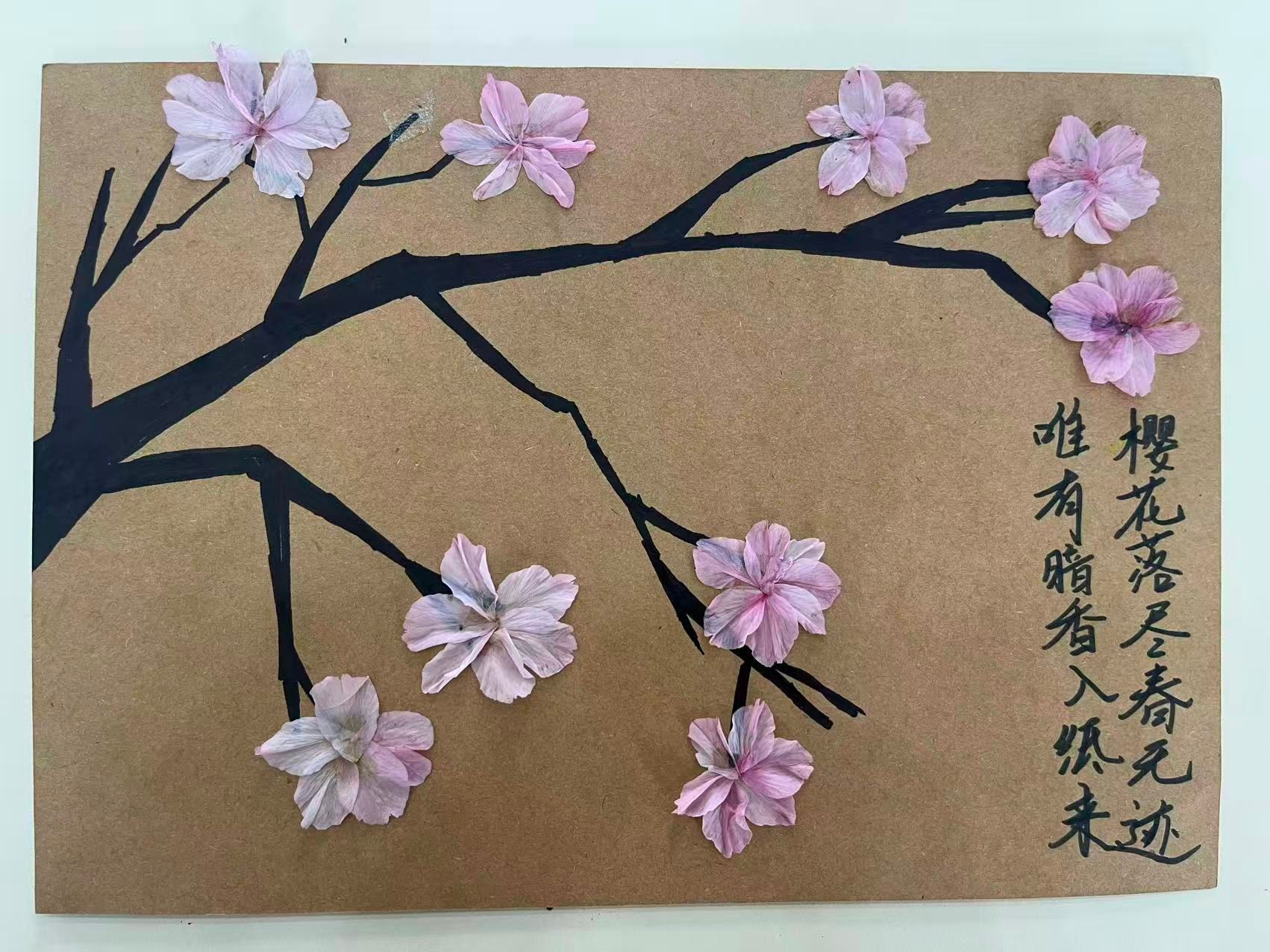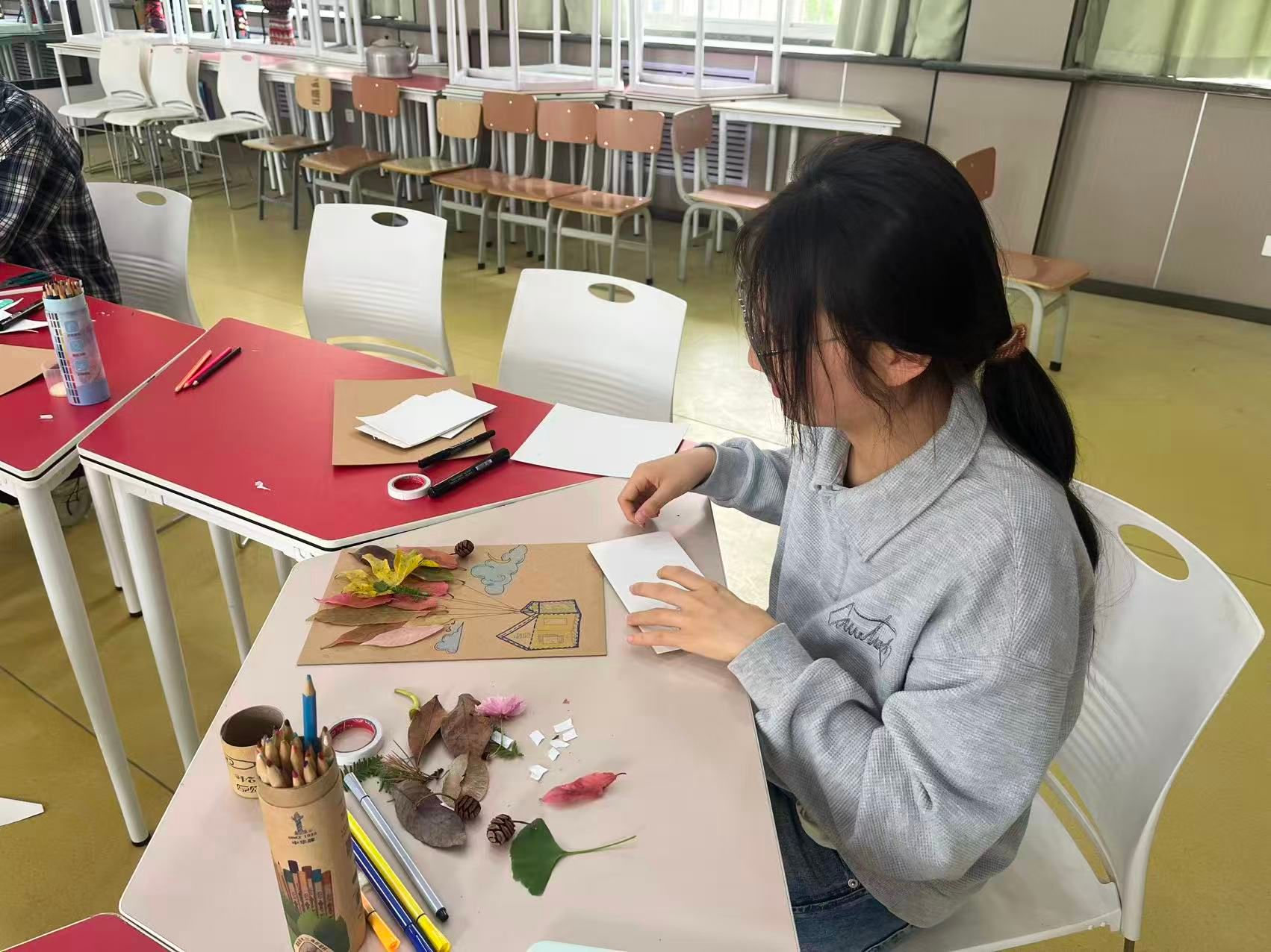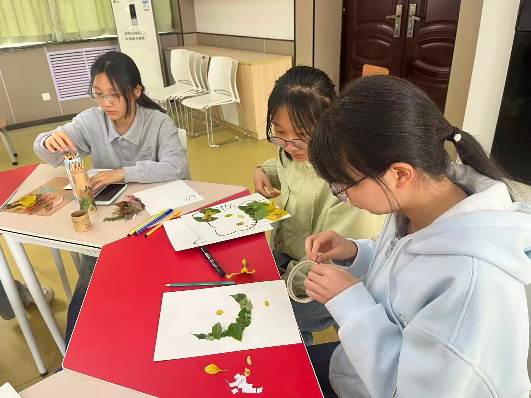 创意拼贴环节中,同学们以收集到的草木、花瓣等自然元素为创作材料,将个人情绪感受、成长感悟融入作品创作,无需遵循标准模板,不追求形式上的完美,让每一片叶、每一根枝、每一朵花都成为个人内心状态的具象表达,最终形成各具特色、独属于参与者个人的自然拼贴作品。